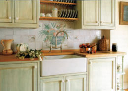 I hand paint kitchens both small and large in a variety of colours. I can paint using any colour you would like either from colour cards and magazines or I can match colours to blend with your existing decoration. Newly installed or old or if it's worn, tired and needs to be revived I can create something traditional or contemporary depending on your needs. I also carry the theme through the room if you wish to create something really special.